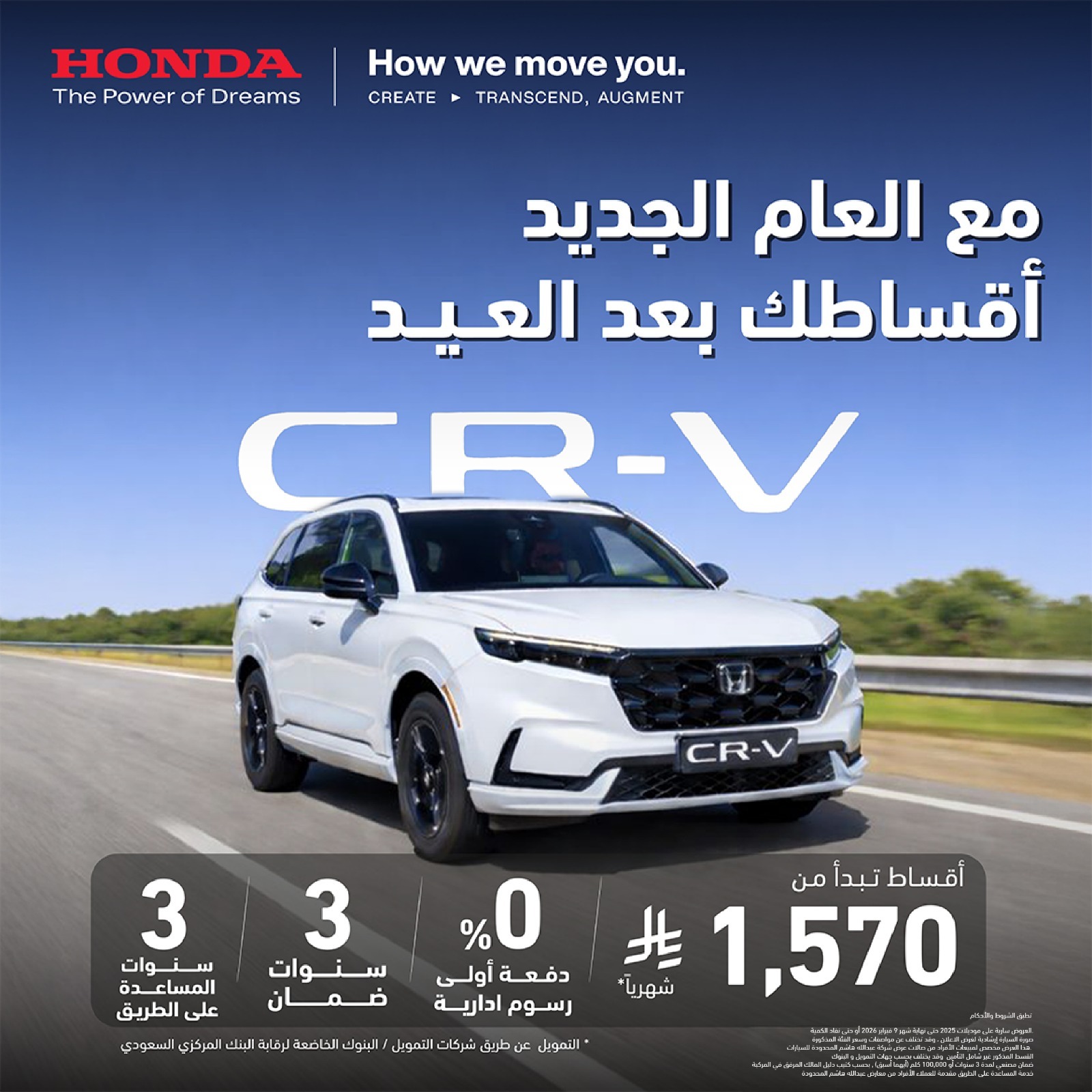 إنها السياره التي وضعت تعريفا لفئتها والآن تعيد تحديد كيف تكون السيارة الرياضية متعددة الاستخدامات المدمجة. اليوم نقدم هوندا CR-V في تصميم وهندسة جديدين لتوفر ثراء في المزايا القياسية مع ملاءمة عالية لكل من السائق والركاب. أهلاً بكم في معايير جديدة للراحة، الأناقة وتعدد الاستخدامات.